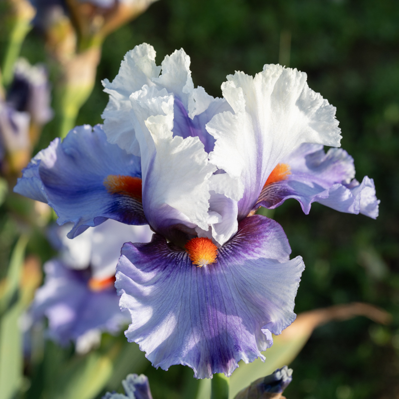 White standards; soft lavender falls with white tipped bright red beards. Late mid-season bloom.