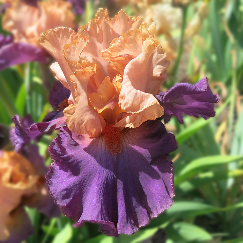 Buff pink standards, rib flushed violet; smooth buff peach falls blending to blue violet then to red violet with burnt orange beards. Mid – late season bloom.