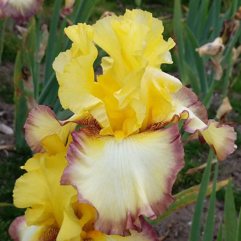 Dark yellow standards; yellow falls with dark brown red band around edge. White gold tipped beards. Mid-season bloom.