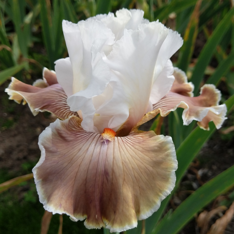 White standards, coffee pink falls with white edge and tangerine beard. Mid-season bloom.