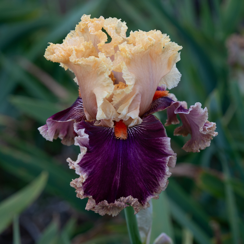 Creamy apricot standards. Plum Burgundy falls with apricot edge and tangerine beard. Heavily ruffled midseason bloom.