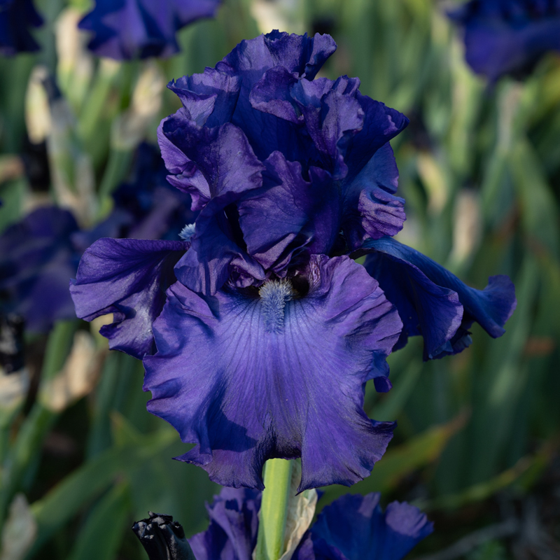 Ruffled, silky dark purple self with violet-black beards. Mid-late season bloom. Dykes Medal Winner.