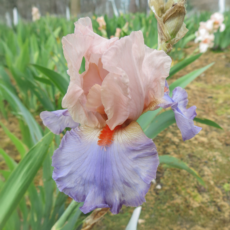 Light pink standards; light bluish lavender falls with pinkish apricot near beards. Bright red orange beards. Mid – late season bloom.