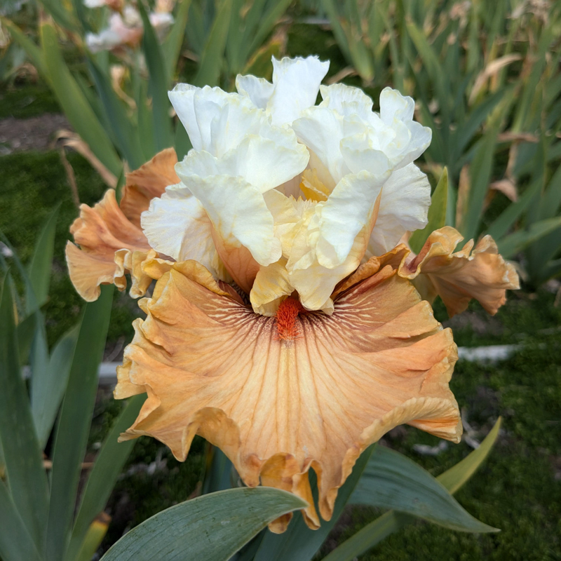 White standards with bright apricot orange tan falls and tangerine beard. Mid to late season bloom.
