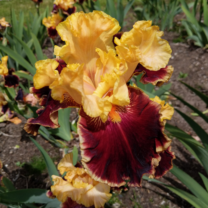Yellow standards; deep red falls with yellow rim; orange beards. Early bloom.