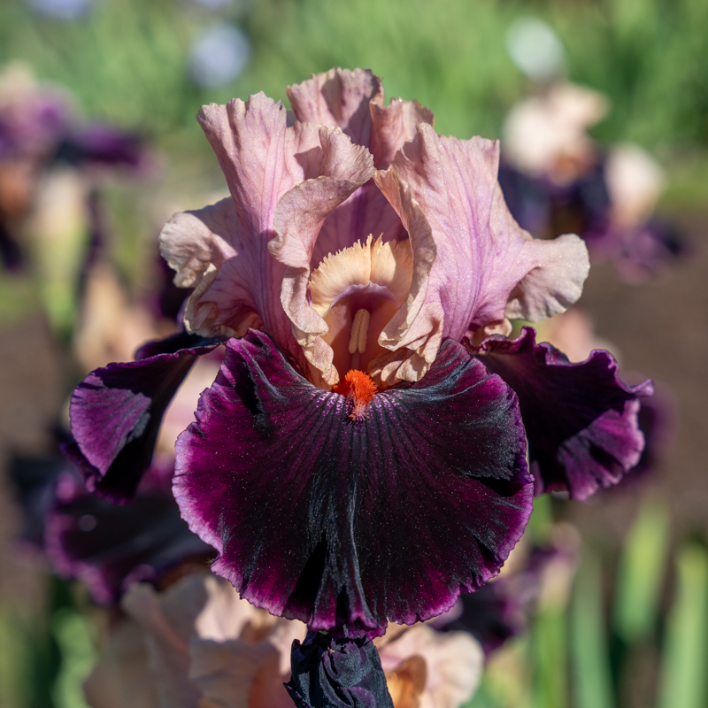 Peach with pinkish rose standards; burgundy black falls with deep tangerine beard. Early to midseason bloom.