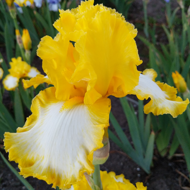 Yellow standards; white falls with yellow band; orange yellow beards.