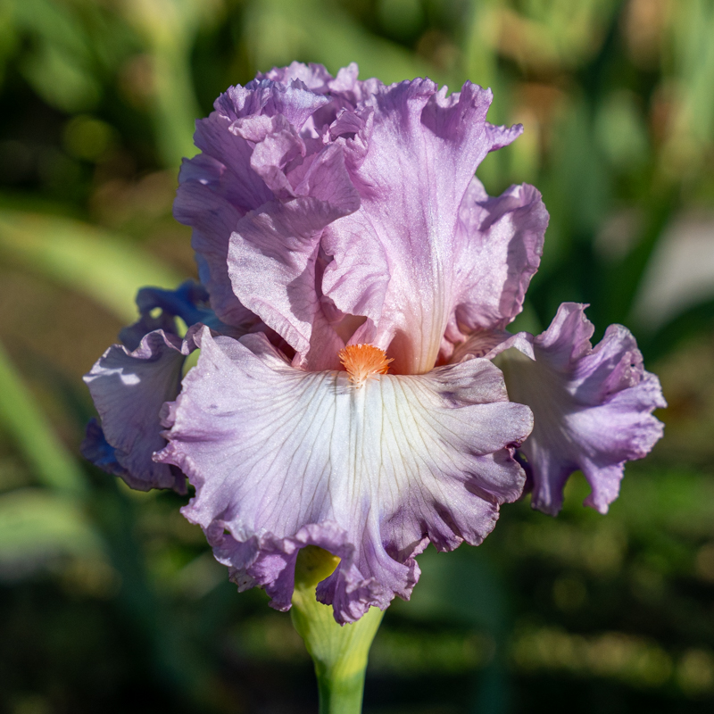 Ruffled silky orchid, falls slightly paler, cream undertoning with melon beard. Mid – late season bloom.