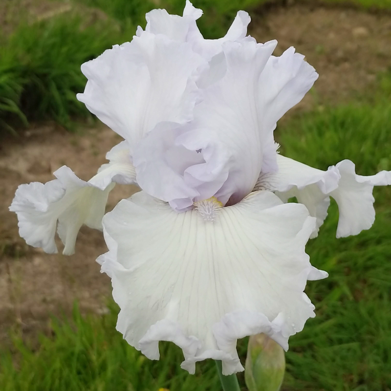 White self with gold white tipped beards. Mid to late season bloom.